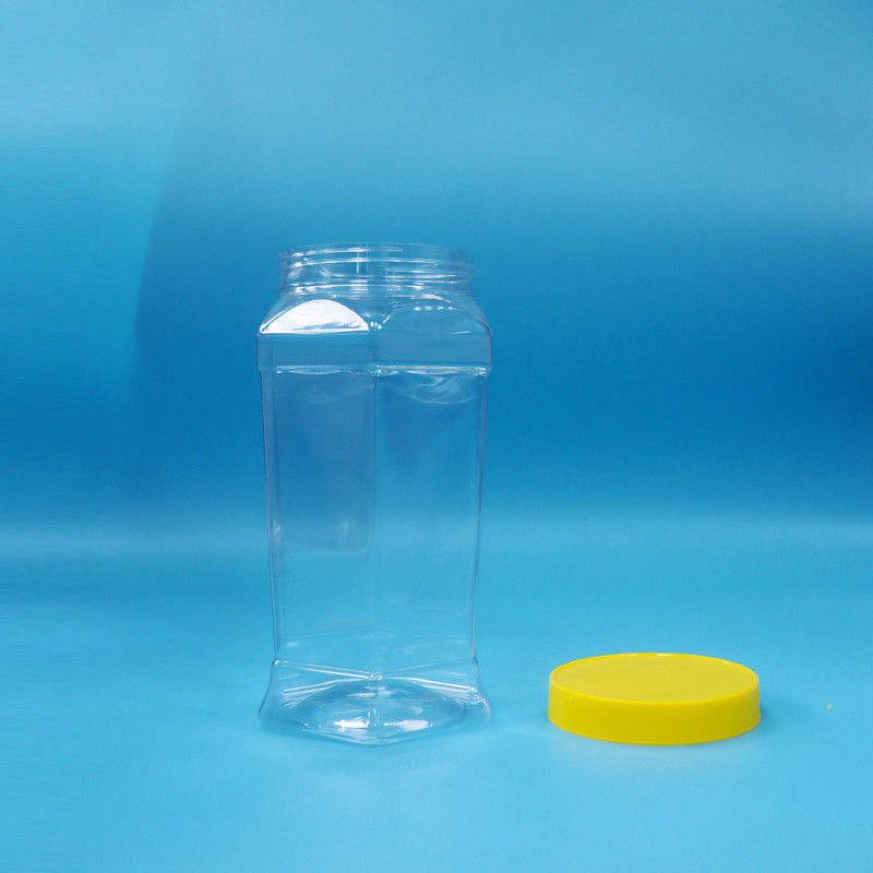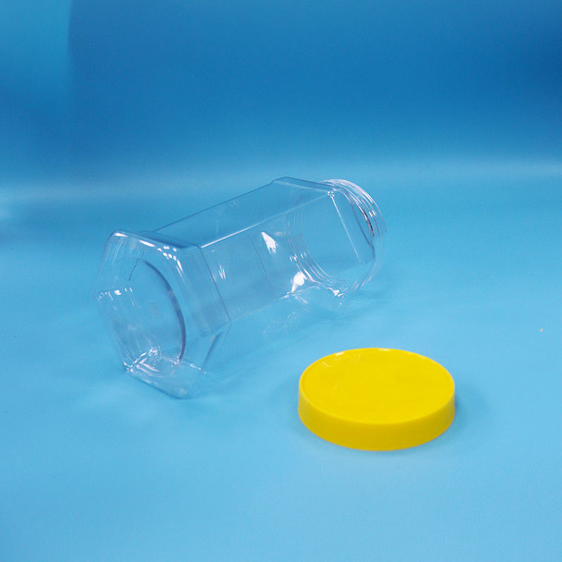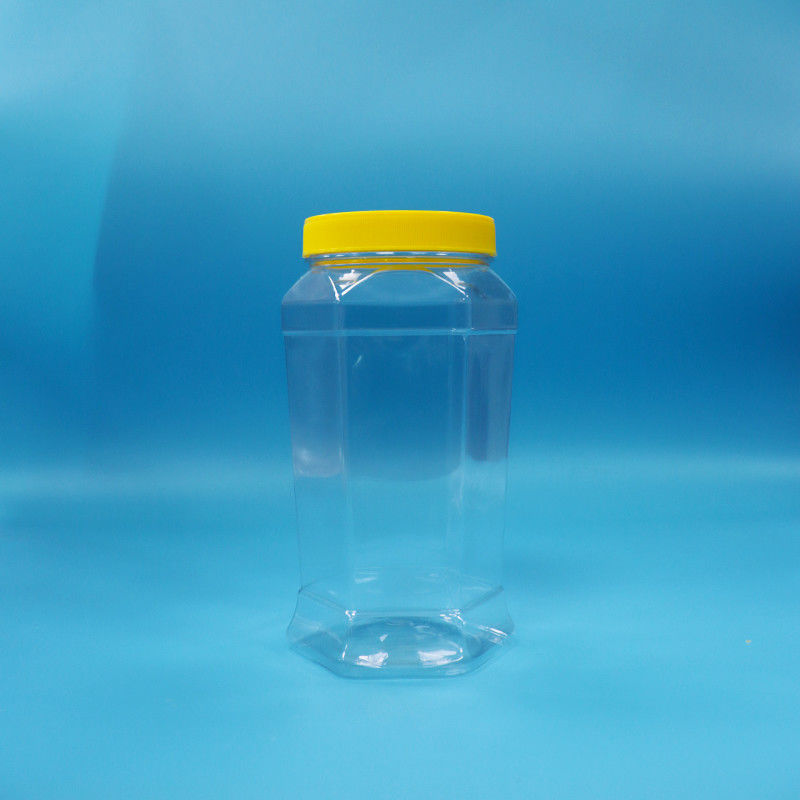 Biscotti per alimenti Caramelle a forma esagonale, vetro trasparente in PET per alimenti, tappo a vite giallo