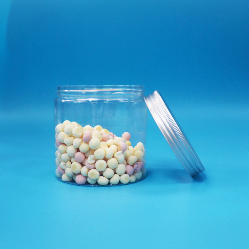 Rotonda bocca larga forma cilindrica PET trasparente biscotti di plastica barattolo Cappuccio a vite in alluminio