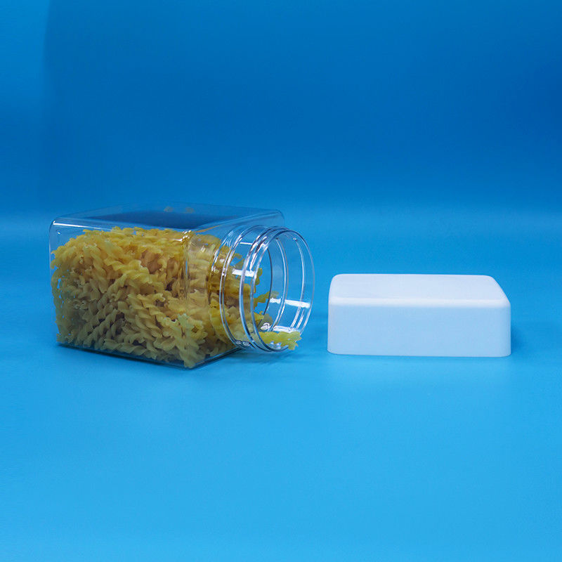 Barattoli quadrati trasparenti in PET per caramelle e snack, per uso alimentare, con coperchi bianchi a vite