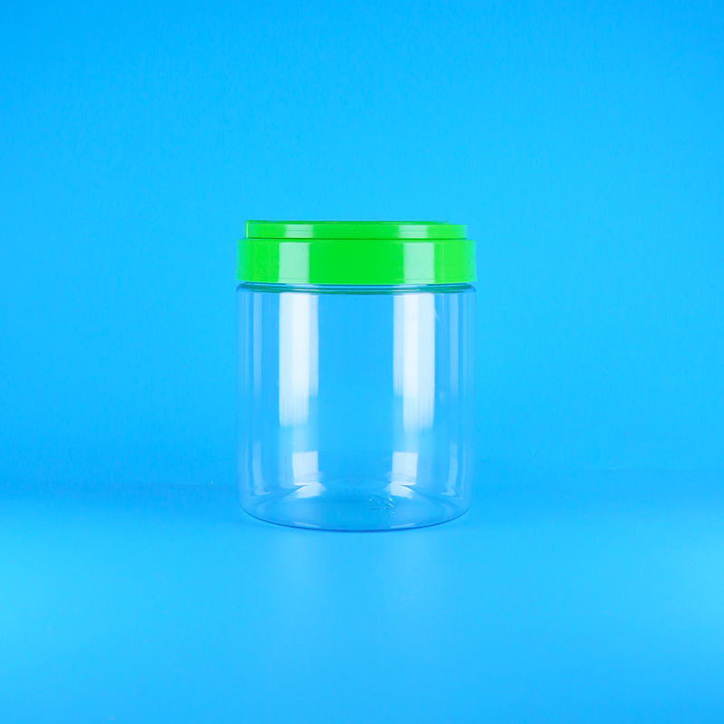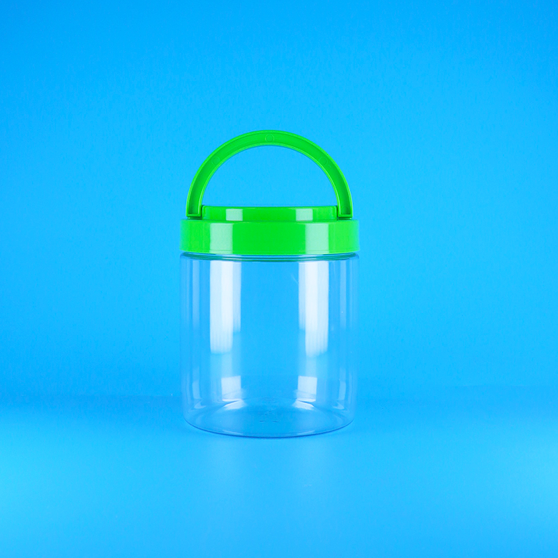 Barattolo rotondo trasparente in PET plastico sigillabile per alimenti con coperchio a vite e manico